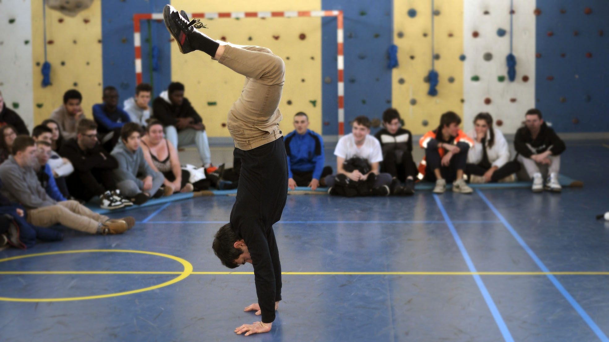 Adrien : Ma première participation était le projet Rencontres au Carré. Je déambulais dans les espaces de vie avec de grands cubes en bois, en improvisant : acrobatie, danse, équilibre. Le lien se faisait par le mouvement.